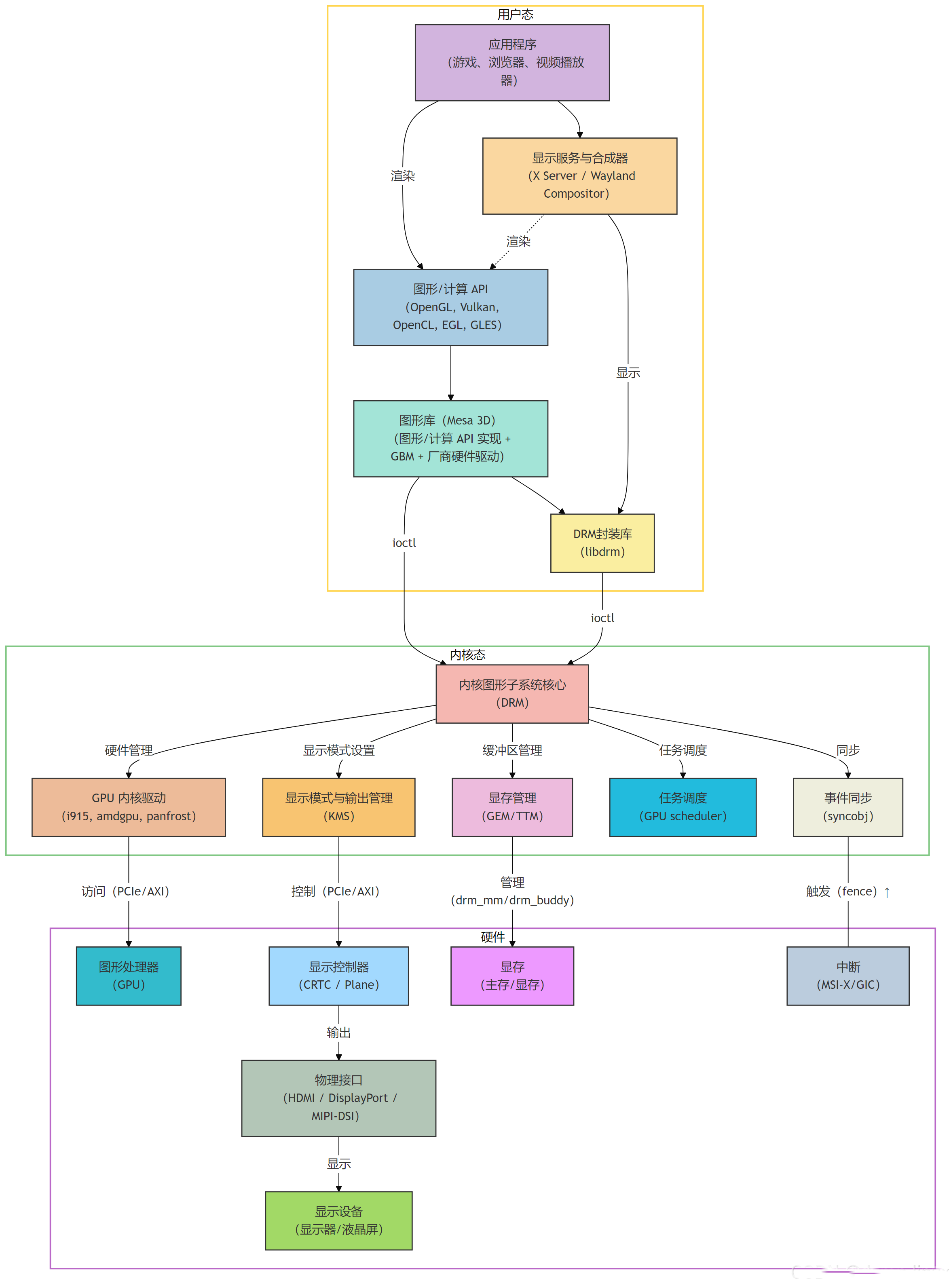 用户态:面向应用程序,提供图形 API 库、显示服务和 DRM 封装库。它负责将应用的渲染需求(例如:“画一个三角形”)转换为具体的硬件指令。