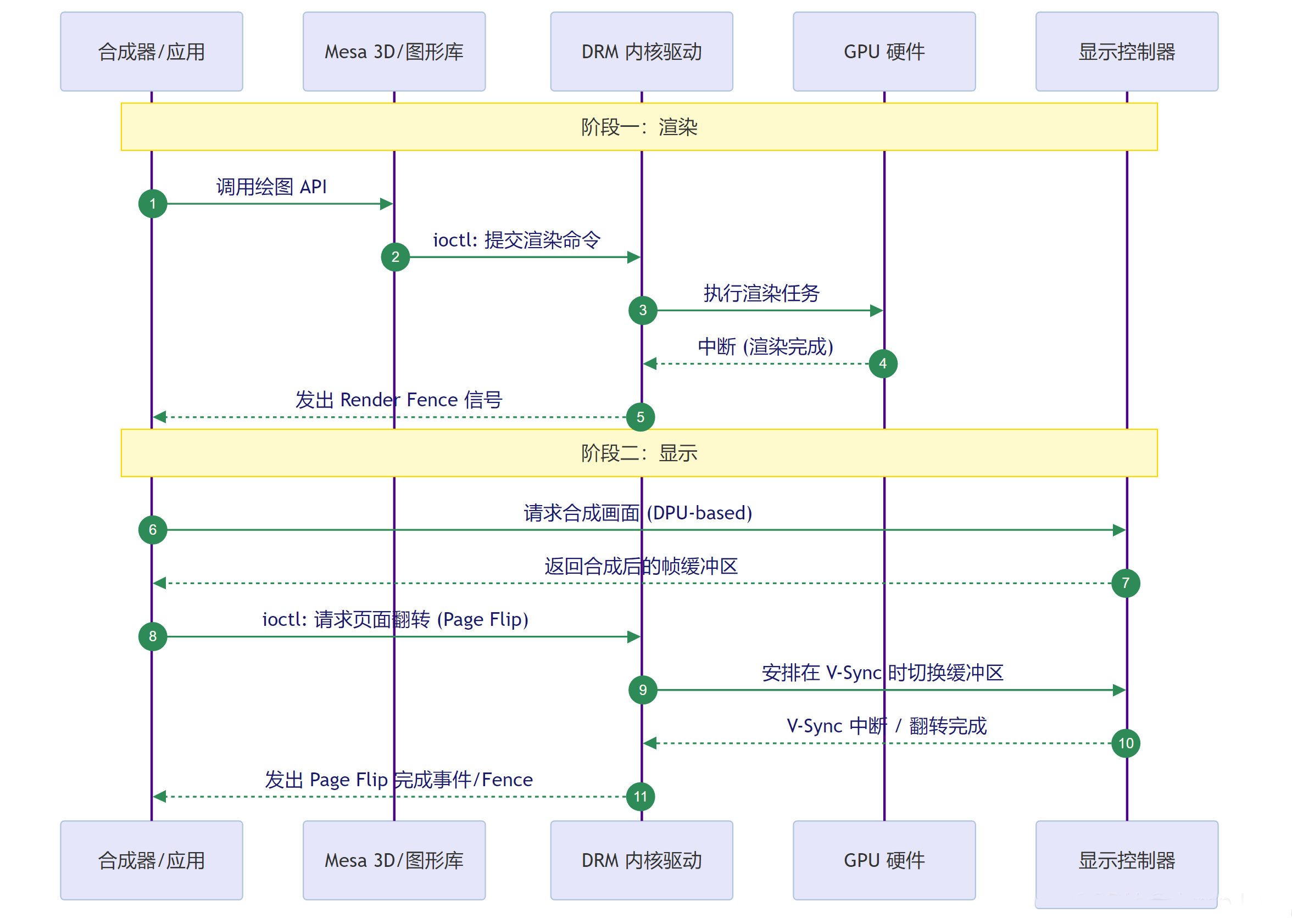 Linux 图形栈中一次完整的“绘制并显示”交互,可分为两大阶段:渲染阶段和显示阶段。二者通过同步对象(Fence)衔接,确保在画面渲染完成后才将其送去显示。
