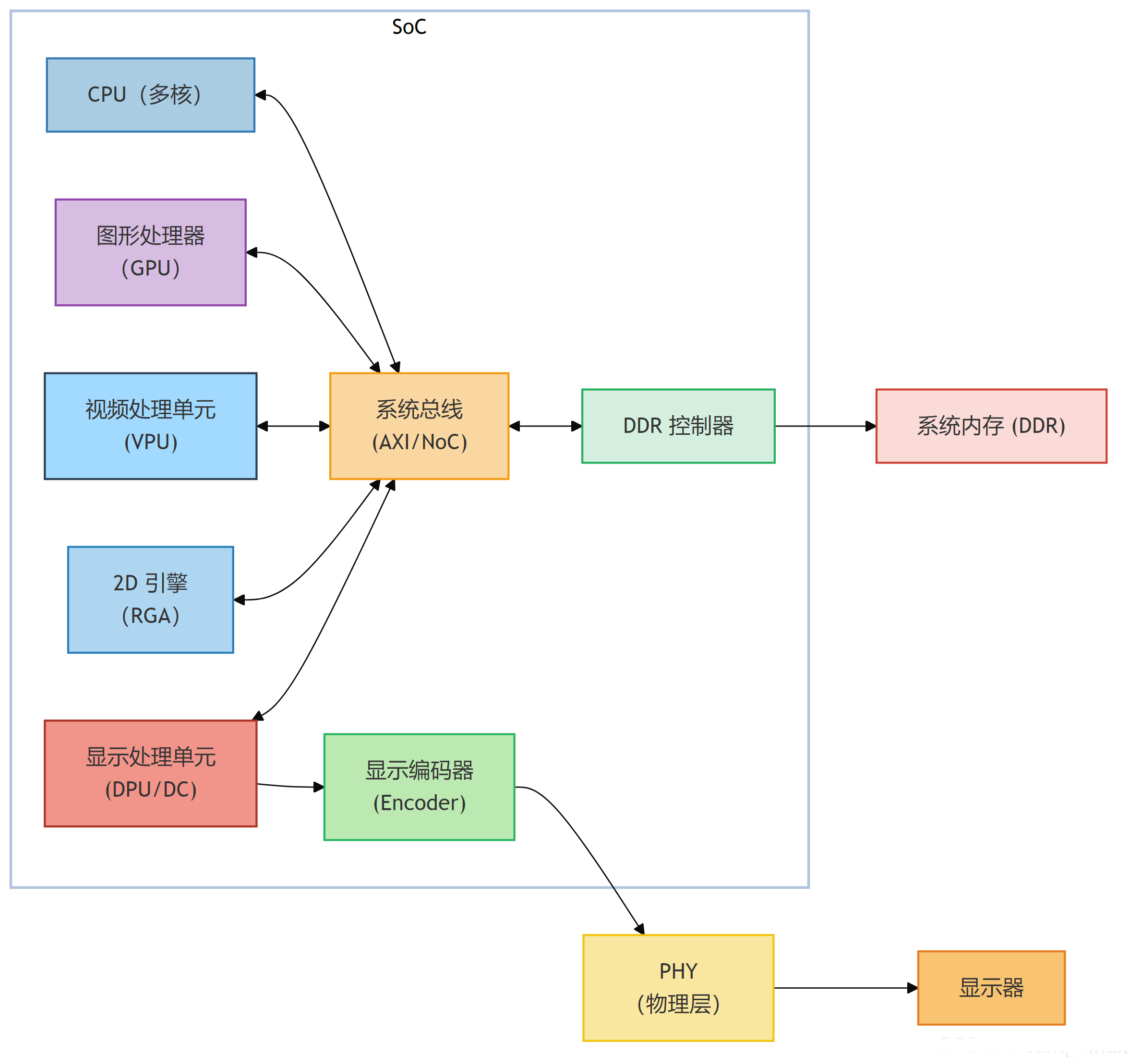 核心关系:CPU、GPU、DPU、VPU、RGA 等多个处理单元通过高速总线(如 AXI)共享对系统内存的访问。CPU 负责任务调度和命令提交,GPU 负责图形渲染,VPU 负责视频编解码,RGA 负责 2D 图像加速,DPU 负责最终的画面合成与时序生成。