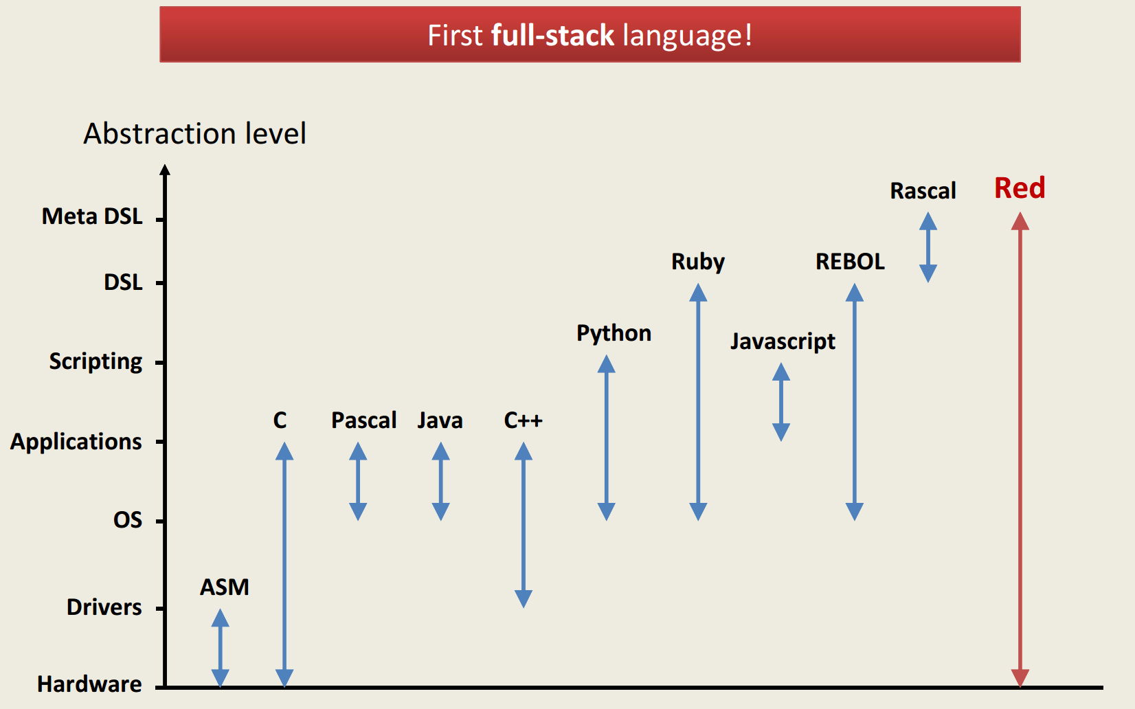 Red language is a native-code compiled functional, imperative, symbolic, and homoiconic programming language that re-uses most of REBOL's syntax and semantics. Both static and JIT compilation support are planned. A strong emphasis is made on concurrency and both task and data parallelism support using an actor-like abstraction and parallel collections (Scala-like). The target range of usage spreads from low-level system programming (thanks to the built-in Red/System C-level DSL) and embedded systems, up to high-level scripting, with an optional REPL console.