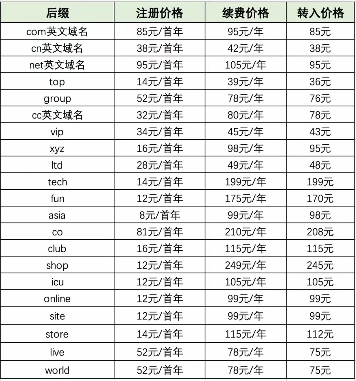 相关域名的预释放抢注保证金也会进行调整,具体以页面显示为准。其余后缀也会视实际情况不定期调整价格,如无特殊情况,将不再另行公告通知,请以阿里云域名价格总览页、域名抢注预订页面等展示价格为准。阿里云域名不定期开展优惠口令、批量优惠包、注册优惠、周三转入日等优惠活动,优惠价格以实际活动规则或订单结算价格为准。