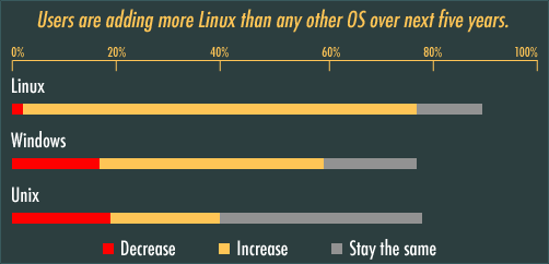 * Migrations to Linux from Windows are surpassing those from Unix, and 66% of users surveyed say that their Linux deployments are brand new (“greenfield”) deployments. This greenfield market share grab is a good indicator of a platform’s future performance.