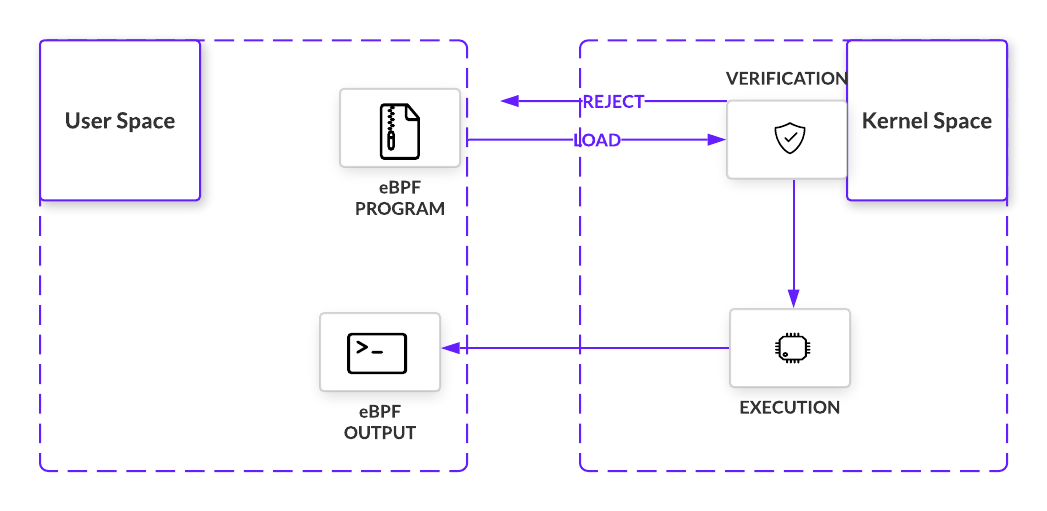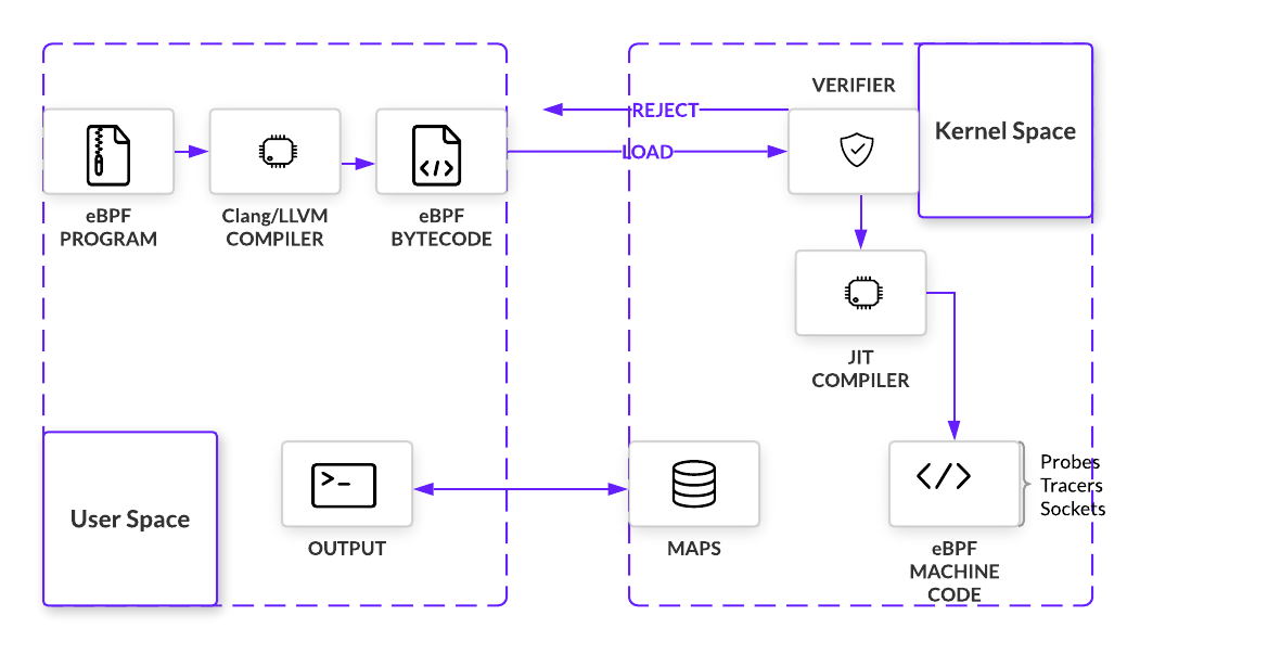 eBPF是Linux内核4.x正式引入的技术,让程序员在不修改内核空间的情况下,能够在内核中执行自定义的字节码并从内核函数中获取更多信息。原本这些目标需要通过系统调用或内核模块来完成,eBPF 降低了所需的复杂度和危险性。简单来说,eBPF 的工作流程: