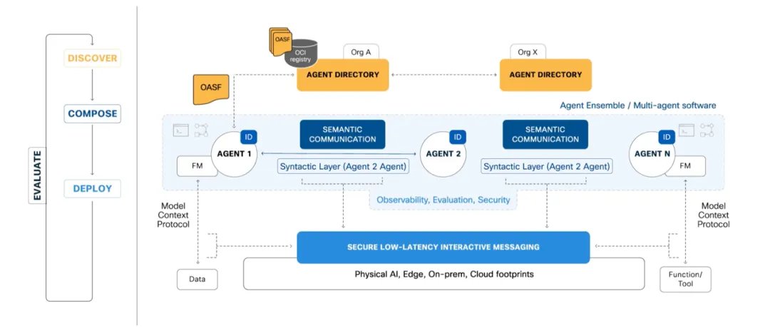 Linux 基金会于2025年7月下旬发文宣布了 AGNTCY 的加入。AGNTCY 是一个开源基础设施,支持不同厂商和框架的 AI 代理之间的发现、身份认证、消息传递和可观测性。Cisco、Dell Technologies、Google Cloud、Oracle 和 Red Hat 作为创始成员加入了 Linux 基金会旗下的 AGNTCY 项目。根据介绍,AGNTCY 最初由 Cisco 于 2025 年 3 月开源,合作伙伴包括 LangChain 和 Galileo。项目已扩大到超过 65 家支持公司,提供 “代理互联网” 的基础设施,这是一层新的协作层,使多智能体系统无论由谁开发、运行在哪里都能协同工作。