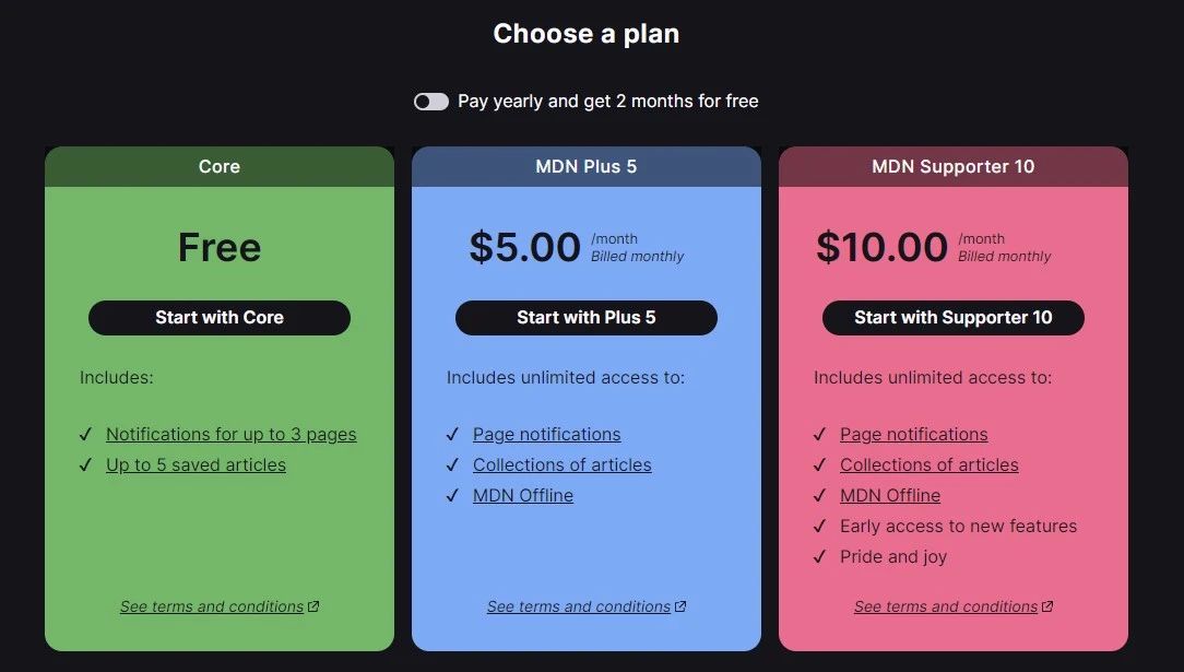 MDN Plus 在用户现在所使用的免费服务之外,提供了 5 美元和 10 美元的月费版本。当用户成为 MDN Plus 付费会员后,可以保存 MDN 页面集合、页面变化的通知(新的 CSS 功能和 API 等),以及离线保存 MDN 并自动更新,以便在网络条件不佳的环境下使用。在 5 美元/月计划(50 美元/年)下,你将获得上述所有功能,而在 10 美元/月计划下(100 美元/年),还可以获得 Mozilla 正在开发的新功能的早期访问权限,并能获得与 MDN 团队直接反馈的渠道。
