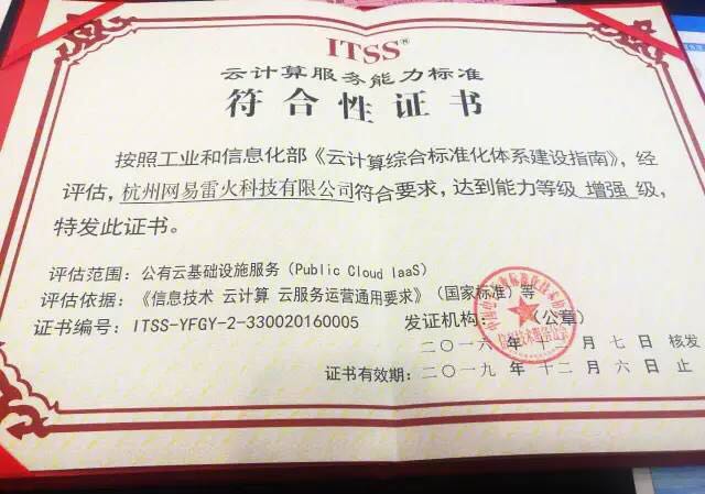 网易云于2022年5月中旬获工信部ITSS颁布云计算服务能力标准符合性证书,并通过“增强级”能力等级认证,成为工信部云计算服务能力首批试点单位。该测评是在中华人民共和国工业和信息化部信息化和软件服务业司指导下,由中国电子工业标准化技术协会信息技术分会(ITSS分会)组织第三方测评机构开展的云计算服务能力测评试点工作。评估参考《信息技术云计算云服务运营通用要求》等国家标准,并编制云计算服务能力评估规范。