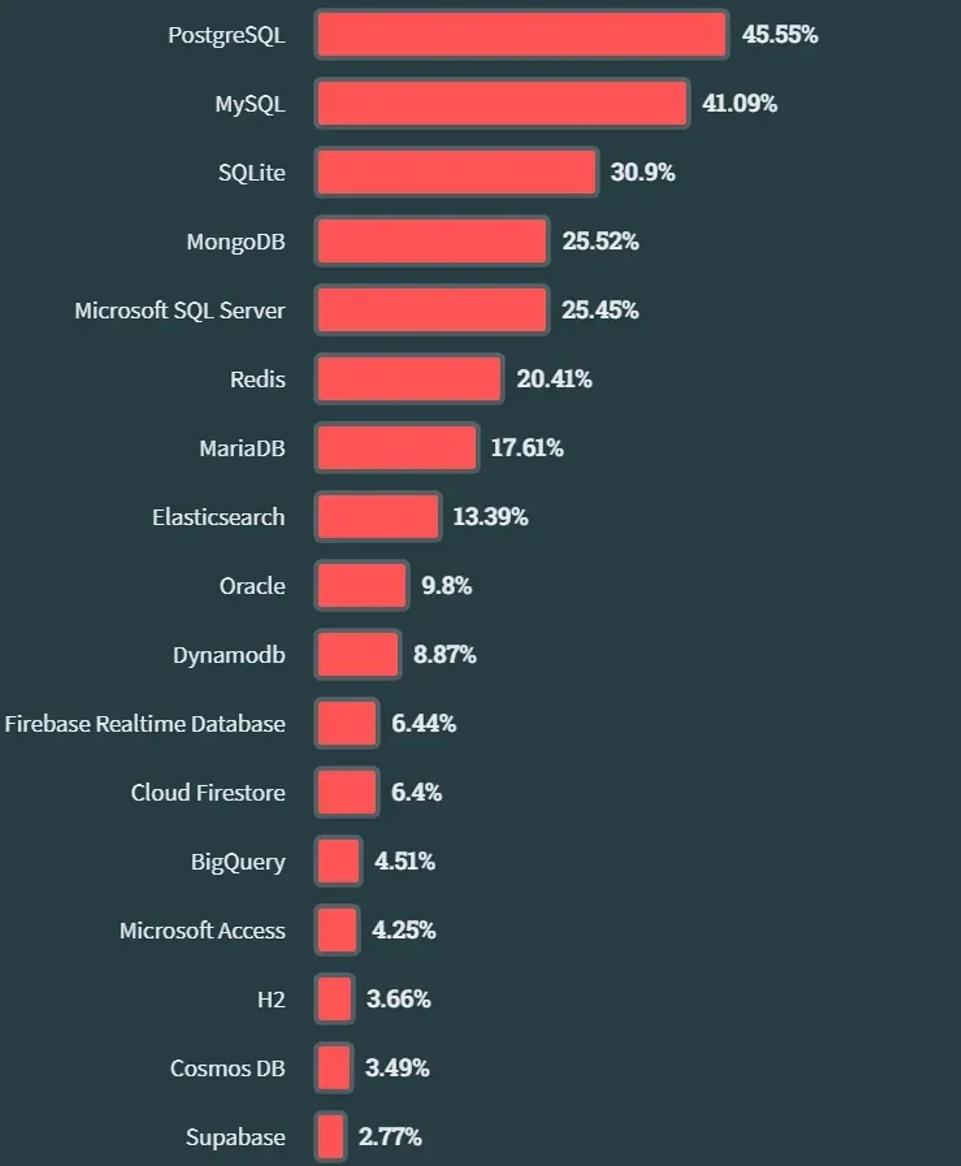 在专业开发者群体中,有 49.09% 的人正在使用 PostgreSQL,比去年上涨 2.61%;MySQL 占比 40.59% 位居第二,SQLite 占比 30.17% 位居第三,DynamoDB 占比 10.31% 超越 Oracle 排名第九位,Oracle 占比 10.06% 位列第十名。