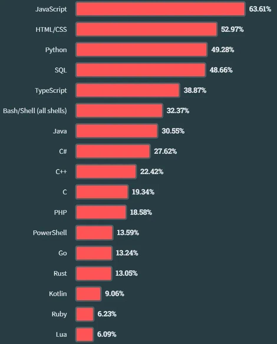 JavaScript 连续 11 年成为最流行编程语言,Python 取代 SQL 成为第三大流行编程语言。其他编程语言比如 Bash/Shell, C, Ruby, Perl 和 Erlang,它们的排名均上升了一位。 Go 和 Rust 的使用情况占比与去年相比也有了一定的上升。