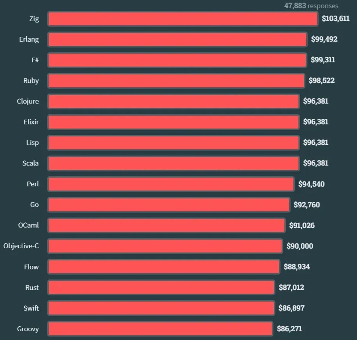 垫底的则分别是 PHP 和 Dart;结合去年的数据来看,Zig 可谓是“横空出世”。去年薪资最高的 Clojure 则掉到了第 5 名。