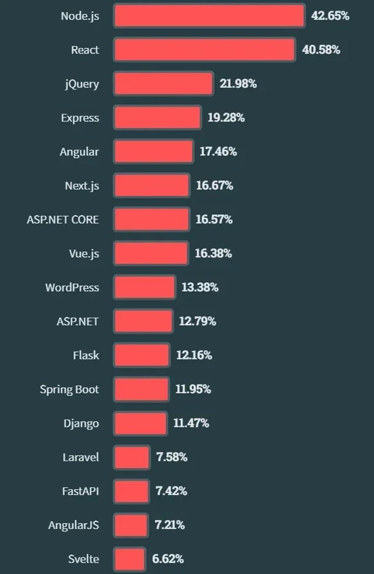 专业开发者使用两者的比例相当,而正在学习编程的人使用 Node.js 多于 React(52% vs 48%)。其他较受欢迎的还包括 jQuery、Express、Angular、Next.js 和 Vue.js。