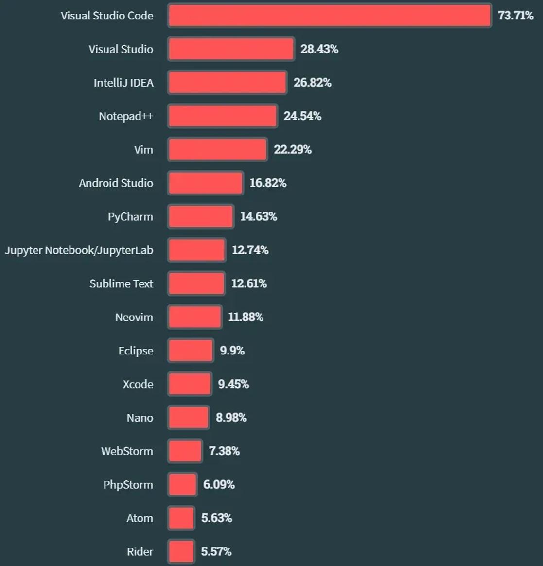 Visual Studio Code 仍然是大多数开发者的首选 IDE,今年它在所有受访者中的使用率从 75% 增加到 81%。
