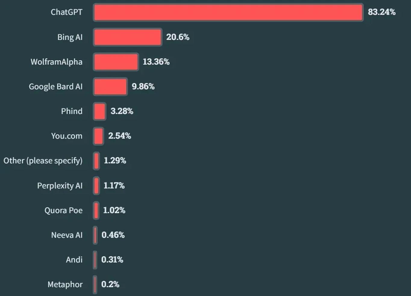ChatGPT 是最受欢迎的 AI 搜索工具,被 83% 的受访者使用,其次是 Bing AI (20%)、WolframAlpha (13%) 和 Google Bard AI (10%)。