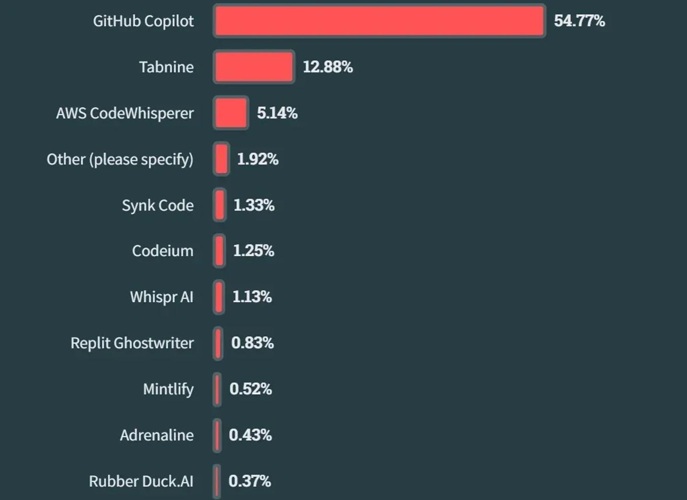 GitHub Copilot 是最受欢迎的 AI 开发工具,被 55% 的受访者使用,其次是 Tabnine (13%) 和 AWS CodeWhisperer (5%)。