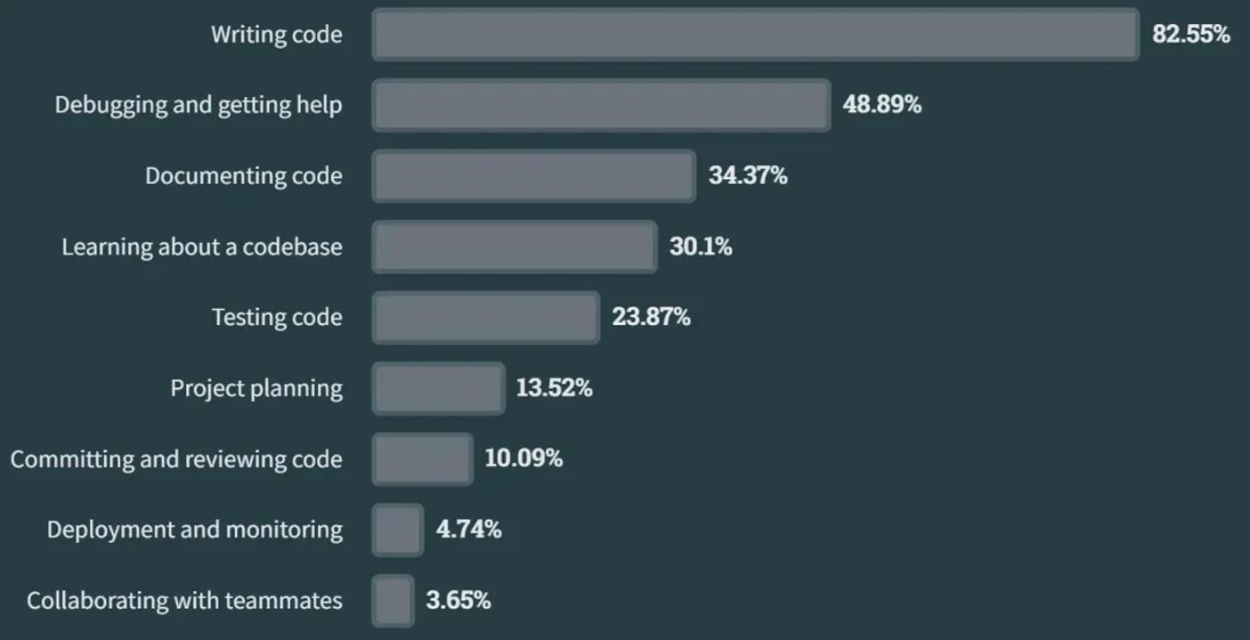 绝大部分开发者使用 AI 工具帮助编写代码,其他的用途包括调试、写文档、学习代码库,以及测试等。
