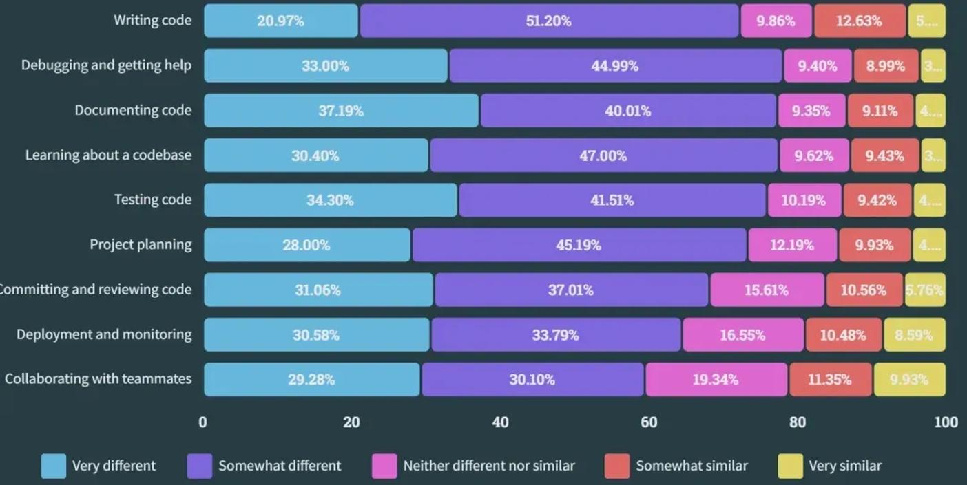 对未来 AI 工具用途变化的期望 无论是专业开发者还是正在学习编程的人,他们都相信开发工作流程将在一年内因为 AI 工具而有所不同。