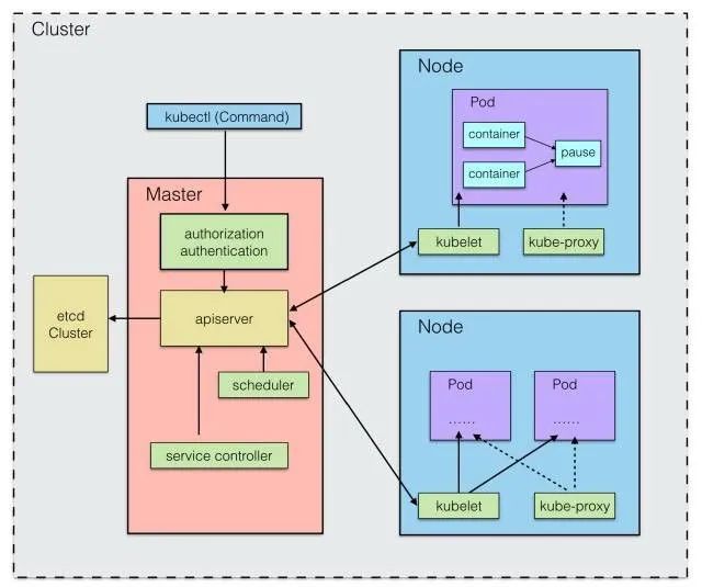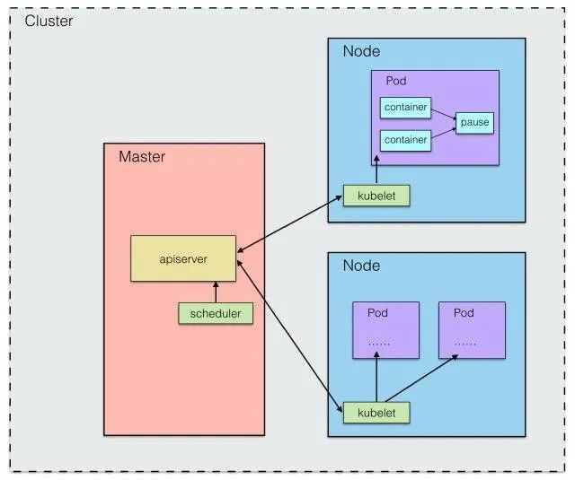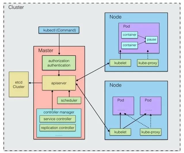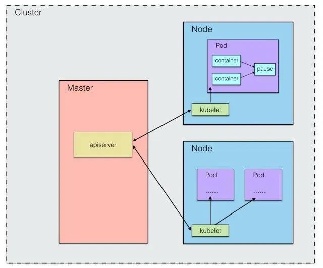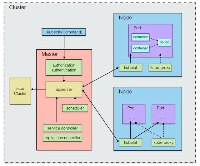 首先,当Master节点启动时,会运行一个Kube-apiserver进程,它提供了集群管理的API接口,是集群中各个功能模块之间进行数据交互和通信的中心枢纽,同时也提供了一个完善的集群安全机制。在Node节点上,利用Kubernetes中的kubelet组件,每个Node节点上都会运行一个kubelet进程,负责向Master汇报本节点的运行状态,如Node节点注册、终止、定期健康报告等等,并接收来自Master的命令并创建相应的Pod。