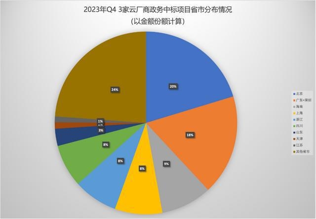 阿里云方面,2023年第四季度,政务项目中标的数量为42个,其中位于北京的项目4个,中标金额为20471.1万元,占比38.4%,主要是因为季度内,阿里云中标2023年学习平台技术和安全运维服务项目,单项目中标金额为1.86亿元/年;海南项目2个,中标金额11689.79万元,占比约 22%,主要是因为季度内,阿里云中标海南人工智能计算中心建设项目设备采购(第二批)项目,单项目金额1.08亿元;浙江项目为18个,金额 10196.68万元,占比约为19%。