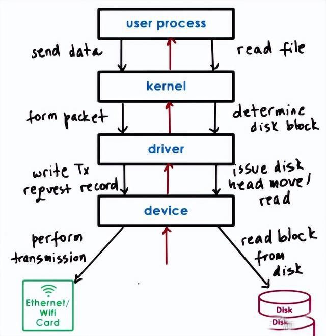 设备驱动程序:这些是插入操作系统以管理特定设备的软件模块。它们提供了一个抽象的接口,使程序可以访问设备而不必知道其详细信息。