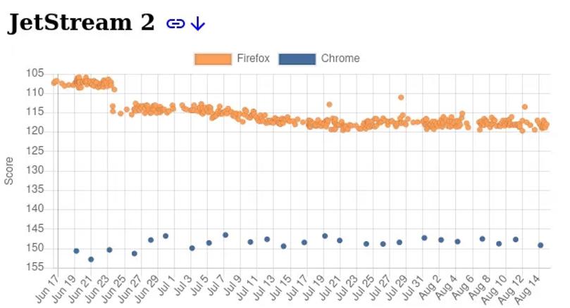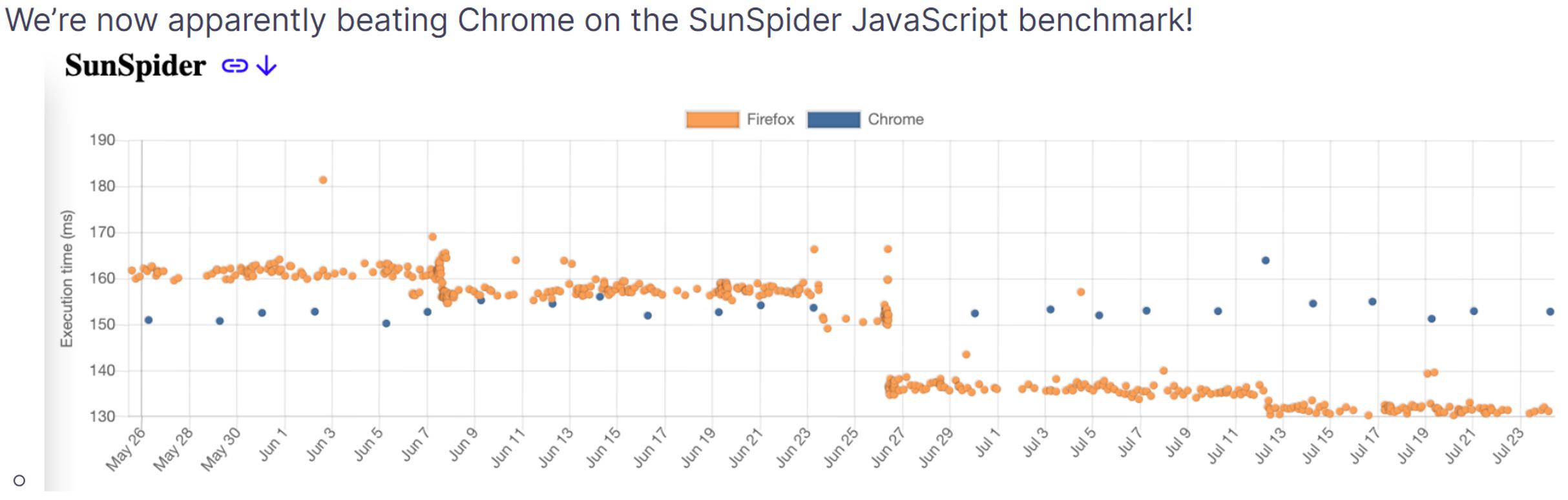Firefox 开发团队在2023年8月中旬表示,在 SunSpider 的 JavaScript 基准测试中已经击败 Chrome。