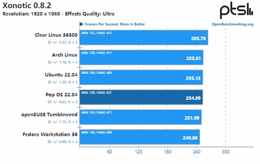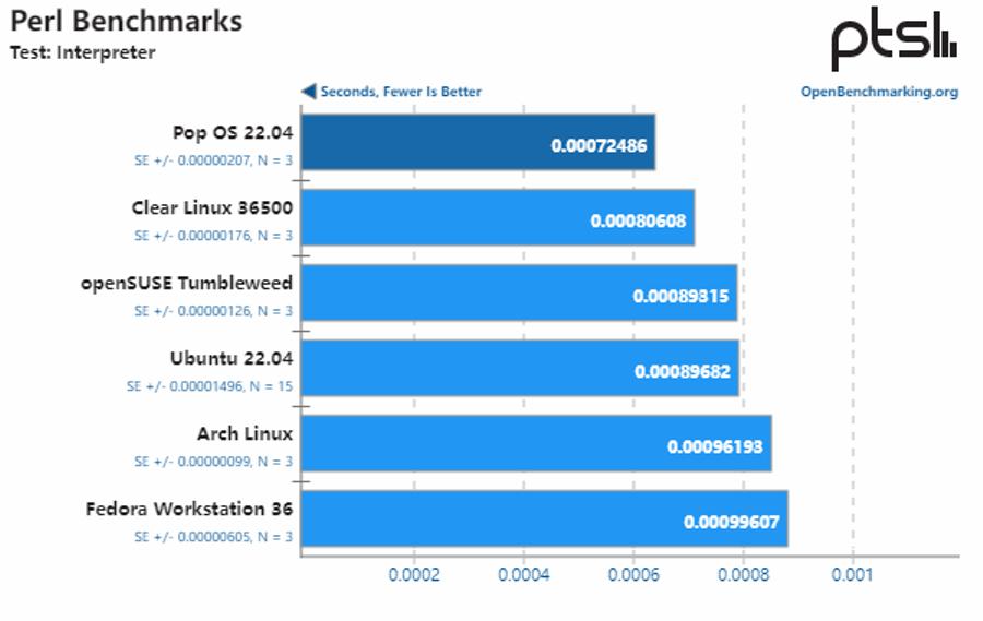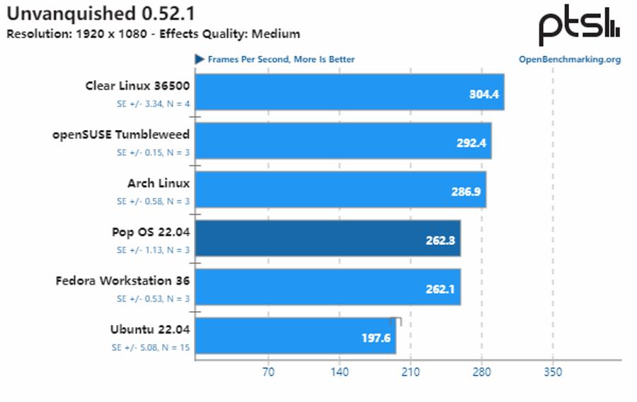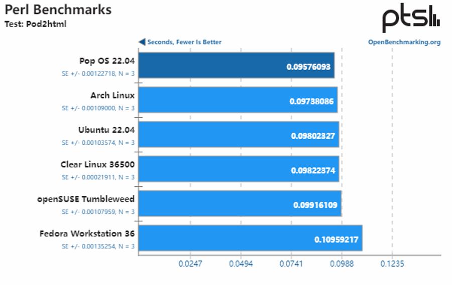 综合所有测试结果来看,Pop!_OS 22.04 与 openSUSE、Fedora Workstation 和 Ubuntu 22.04 的性能基本保持一致,而 Arch Linux 的性能则明显落后于其他发行版。同时,由于 Clear Linux 采用了激进的默认性能调整方案、额外补丁和其他优化,它提供了比其他 Linux 发行版高约 13% 的整体性能。