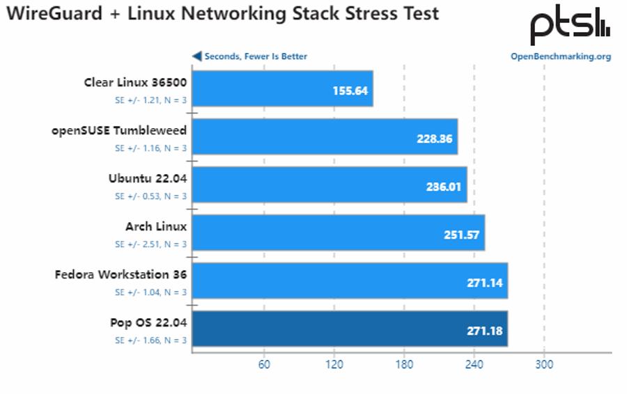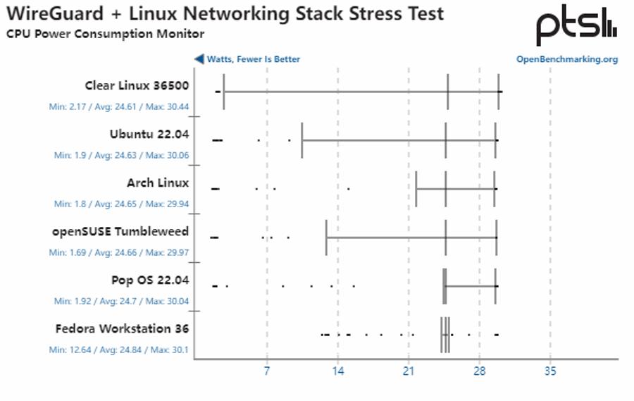 该项测试基于 WireGuard VPN 隧道软件进行,可以看到,Clear Linux 的性能明显优于所有其他经过测试的 Linux 发行版,并且测试期间没有检测到 CPU 核心温度、功耗有显著差异。