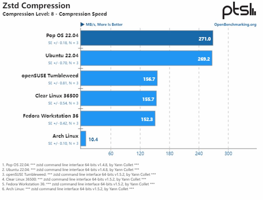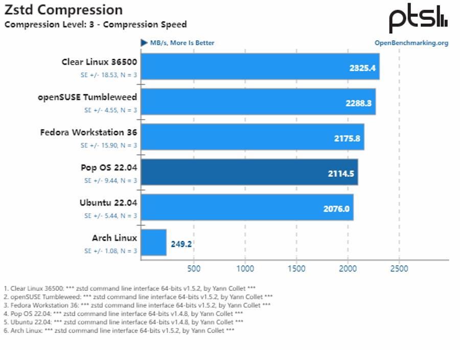 参与测试的六个 Linux 发行版在 Zstd 压缩性能方面的差异十分有趣,比如 Clear Linux 由于默认选择多线程,以及开箱即用的性能优势,所以在测试中经常领先。但奇怪的是,Arch Linux 的性能与其他发行版相差甚远。