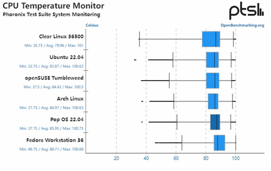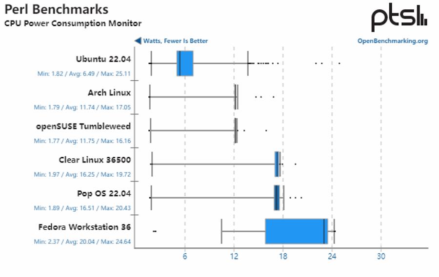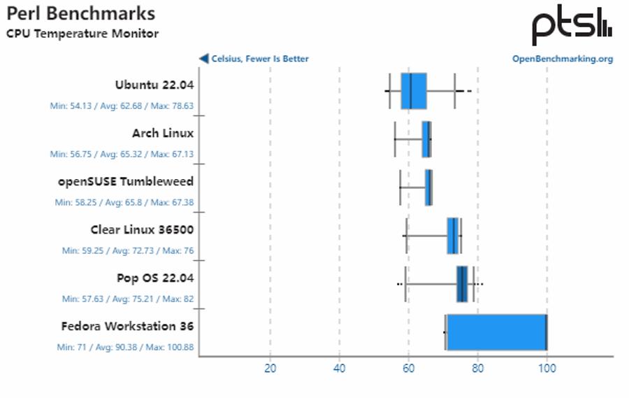 在这部分测试中,Fedora Workstation 36 的测试结果全部垫后,性能明显比其他发行版缓慢,执行速度也明显低于其他 Linux 发行版。它的功耗和 CPU 温度也高得多。