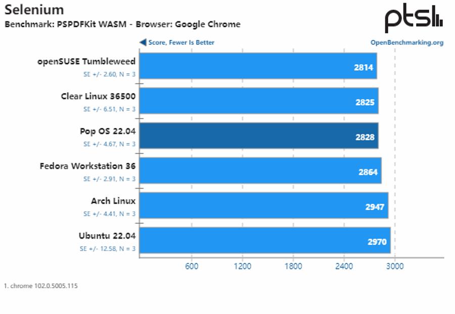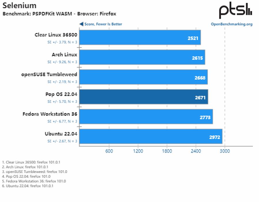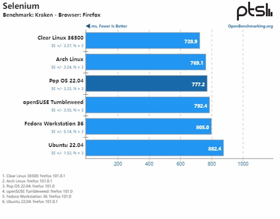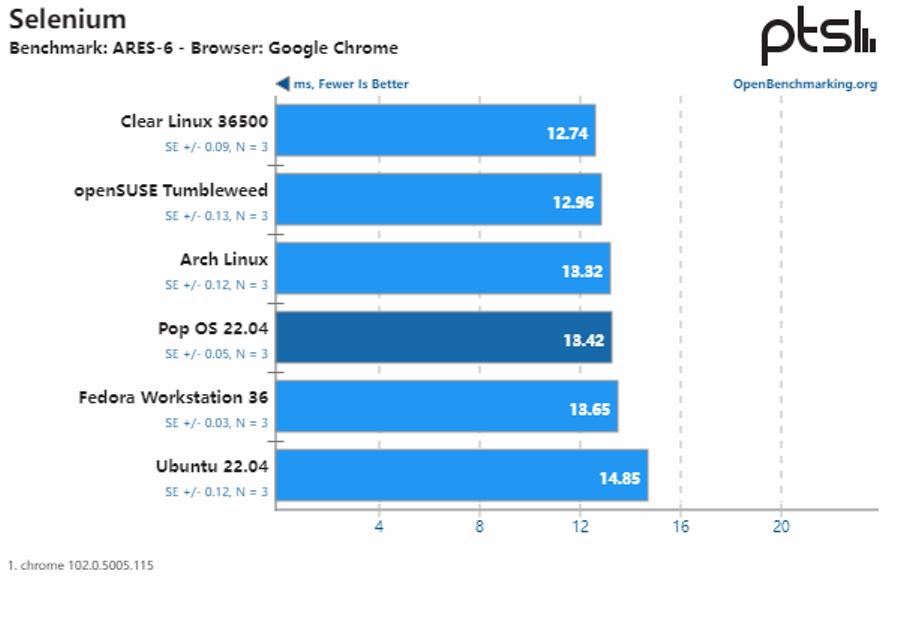 通过运行 Selenium 自动化测试套件,可以看到这些发行版在浏览器性能方面的差异不大。相对而言,Clear Linux 在 HP Dev One 笔记本电脑上提供了最佳的浏览器性能。