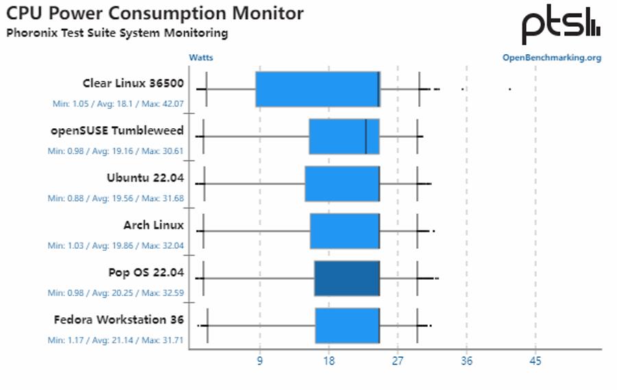 对于整个基准测试范围内的 CPU 功耗。除了 Clear Linux 之外,Linux 发行版之间没有太大变化。虽然 Clear Linux 默认使用了 Performance Governor,但与其他经过测试的 Linux 发行版相比,它在低功耗状态下花费的时间也更多。Clear Linux 确实提供了为节能而调整的补丁,以保持 CPU 运行效率并最大限度地发挥系统的涡轮潜力。也正是 Clear Linux 上的 Performance Governor,其峰值 CPU 功耗也明显高于其他发行版。