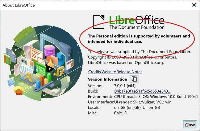事情始于本月初在 LibreOffice 社区的邮件列表中出现的一个错误报告,该错误报告是由一名用户提出的,该用户发现最新安装的 LibreOffice 7.0 RC 版现已被标记为 “个人版”,并且在 about 对话框中声明 “该个人版由志愿者支持并仅供个人使用”。