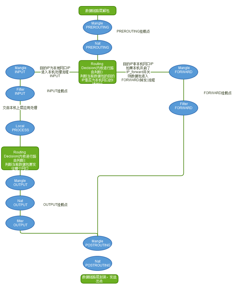 1.当一个数据包进入网卡时,数据包首先进入PREROUTING链,在PREROUTING链中我们有机会修改数据包的DestIP(目的IP),然后内核的"路由模块"根据"数据包目的IP"以及"内核中的路由表" 判断是否需要转送出去(注意,这个时候数据包的DestIP有可能已经被我们修改过了);