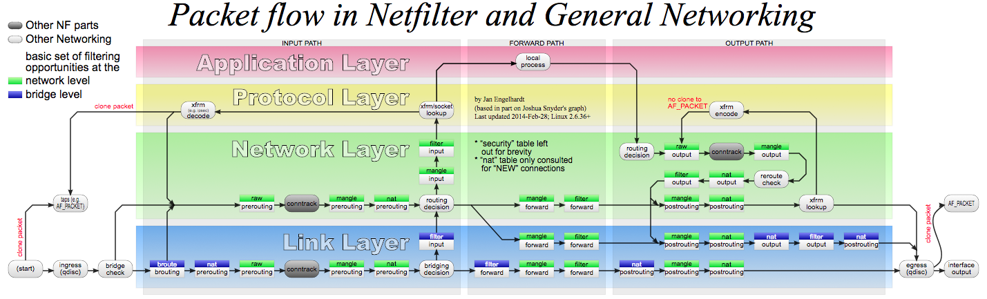 | Tables↓/Chains→ | PREROUTING | INPUT | FORWARD | OUTPUT | POSTROUTING |