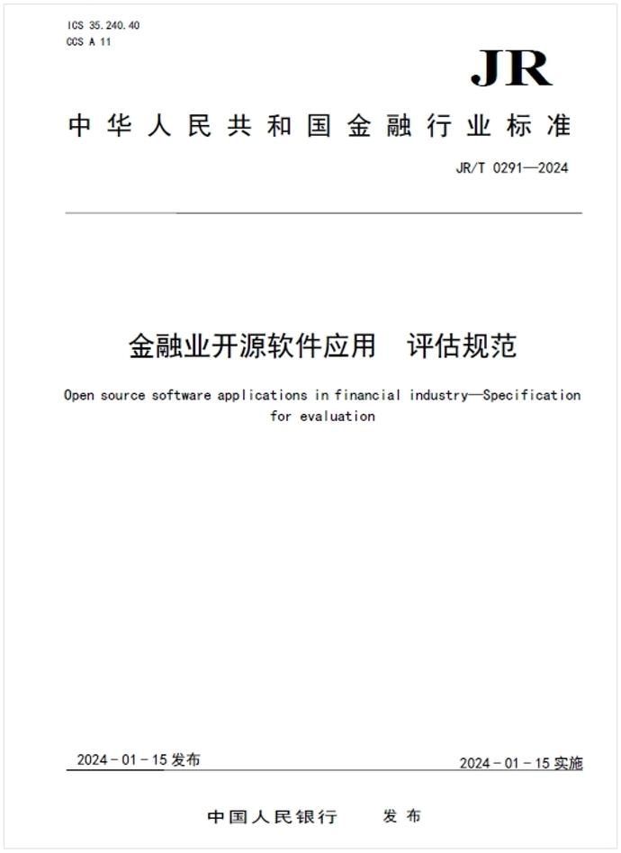 2024年1月15日,人民银行发布金融行业标准《金融业开源软件应用 评估规范》(JR/T 0291-2024)(以下简称 “《规范》”),于当天实施。