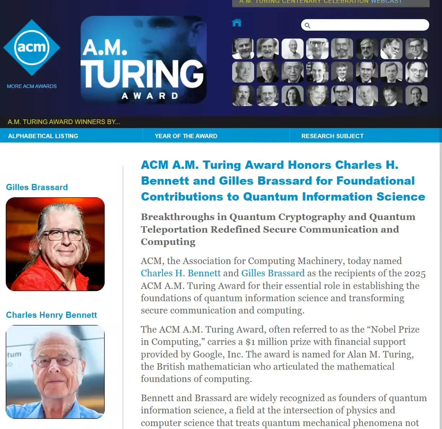 美国计算机协会(ACM)宣布将 2025 年图灵奖(ACM A.M. Turing Award)授予美国物理学家、IBM 研究员查尔斯・贝内特和加拿大计算机科学家、蒙特利尔大学教授吉尔・布拉萨德,以表彰他们在奠定量子信息科学基础,以及推动安全通信和量子计算发展方面作出的开创性贡献。