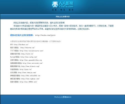 同日,人人影视暂时关站,“网站正在清理内容,感谢大家的厚爱和支持”。上月底,人人影视字幕站官方微博曾表示,受版权压力,将在11月底彻底清除所有无版权资源下载链接。随后该微博被删。