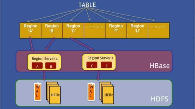 如图所示,在 HBase 中,Table 被横向划分为 Region,它是一段数据的管理者,Region 被分发到 RegionServer 上进行管理,一个 Region 只被一个 RegionServer 管理,它的数据存储在 HDFS 上,是可以有多个副本的。