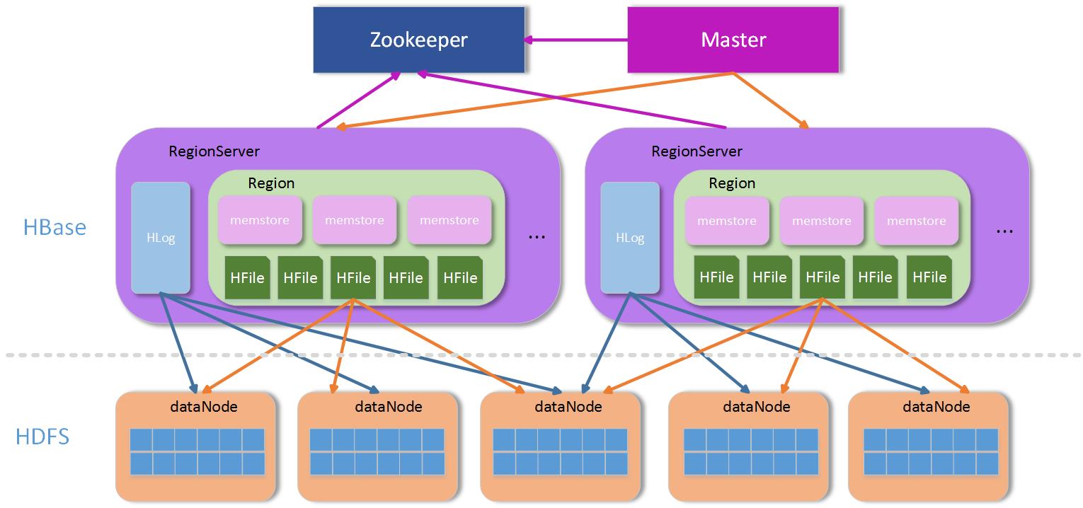 整个架构中,ZK用于服务协调和整个集群运行过程中部分信息的保存和-ROOT-表地址定位,Master用于集群内部管理,所以剩下的RS主要用于处理数据。