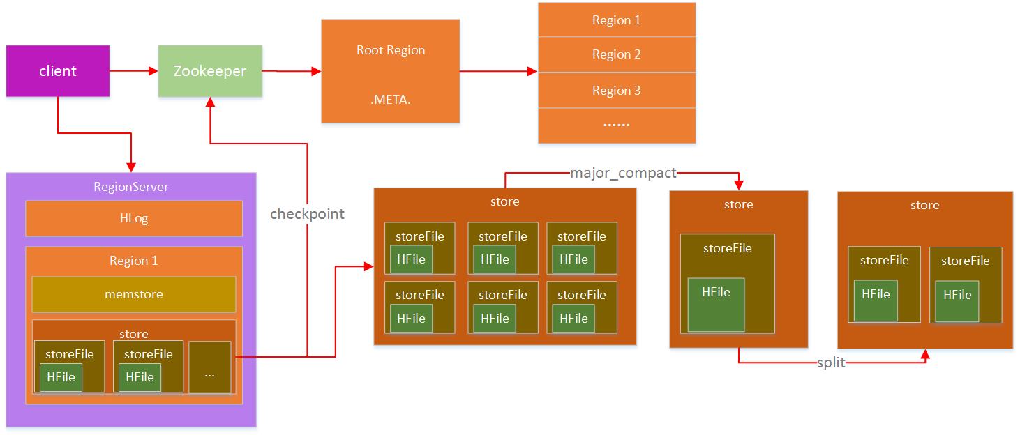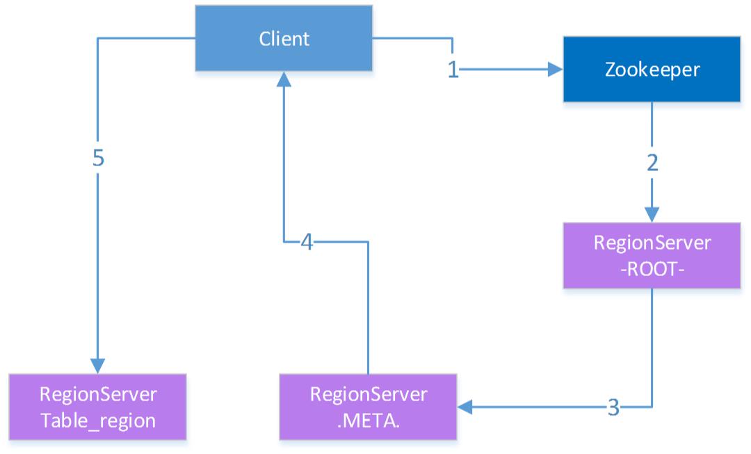 访问HBase通过HBase客户端(或API)进行,整个HBase提供给外部的地址,其实是ZK的入口,前面也介绍了,ZK中有保存-ROOT-所在的RS地址,从-ROOT-表可以获取.META.表信息,根据.META.表可以获取region在RS上的分布,整个region寻址过程大致如下:
