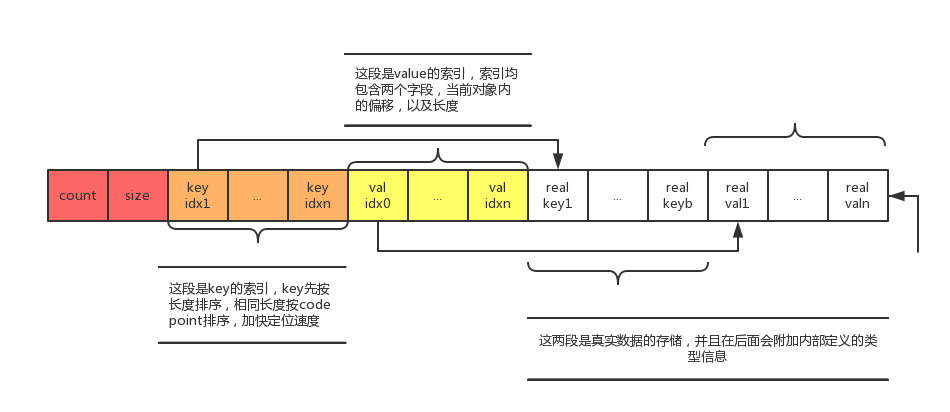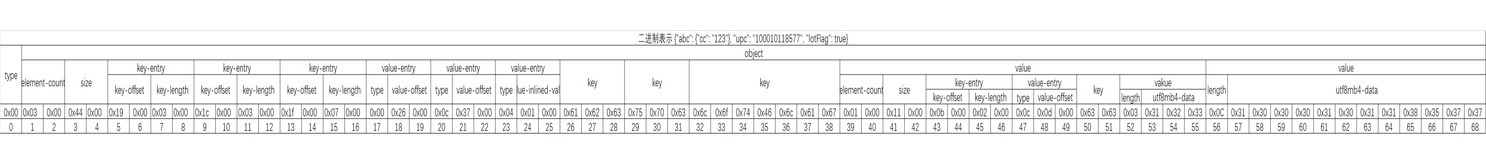 1).JSON 对象的 Key 索引(图中橙色部分)都是排序好的,先按长度排序,长度相同的按照 code point 排序;Value 索引(图中黄色部分)根据对应的 Key 的位置依次排列,最后面真实的数据存储(图中白色部分)也是如此