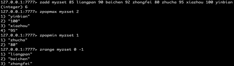 127.0.0.1:6379> ZADD exam 98 "a1" 90 "a2" 78 "a3" 60 "a4" 58 "a5" 50 "a6"