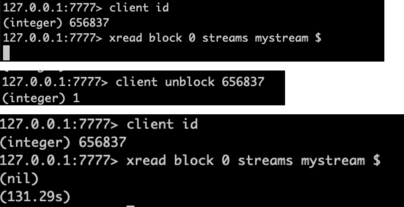 XREAD BLOCK 0 STREAMS key $ 永久堵塞,知道流key接收到最新数据,会显示阻塞时间
