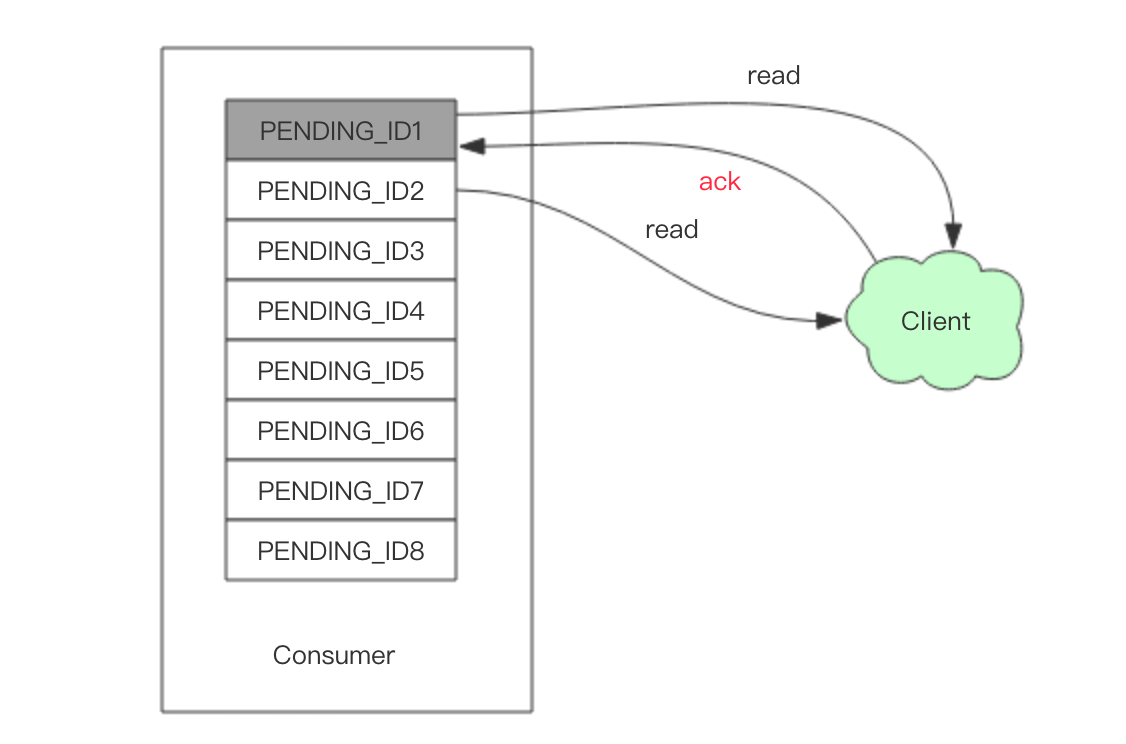 消费者对象内还维持了一个Pending_ids,Pending_ids记录已发送给客户端,但是还没完成ACK(消费确认)的元素id。
