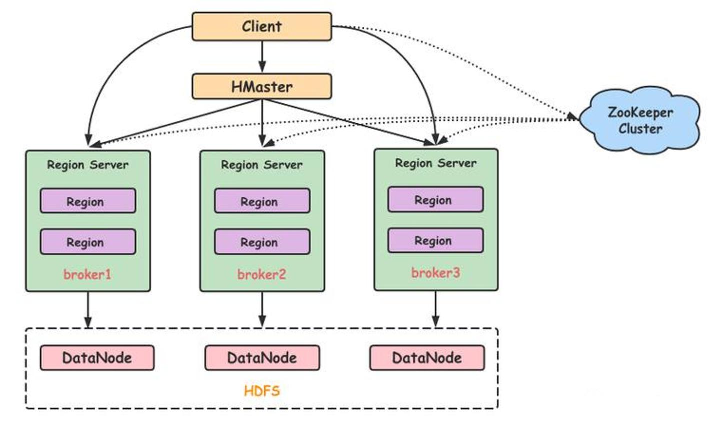 可以看到,client访问hbase上数据的过程并不需要master参与(寻址访问zookeeper和region server,数据读写访问regione server),master仅仅维护者table和region的元数据信息,负载很低。
