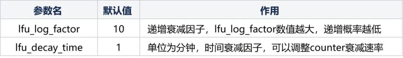 LFU counter 的计算也并非 “一尘不变”,为了适配各种业务数据的特性,Redis 在 LFU 算法实现过程中引入了两个可调参数: