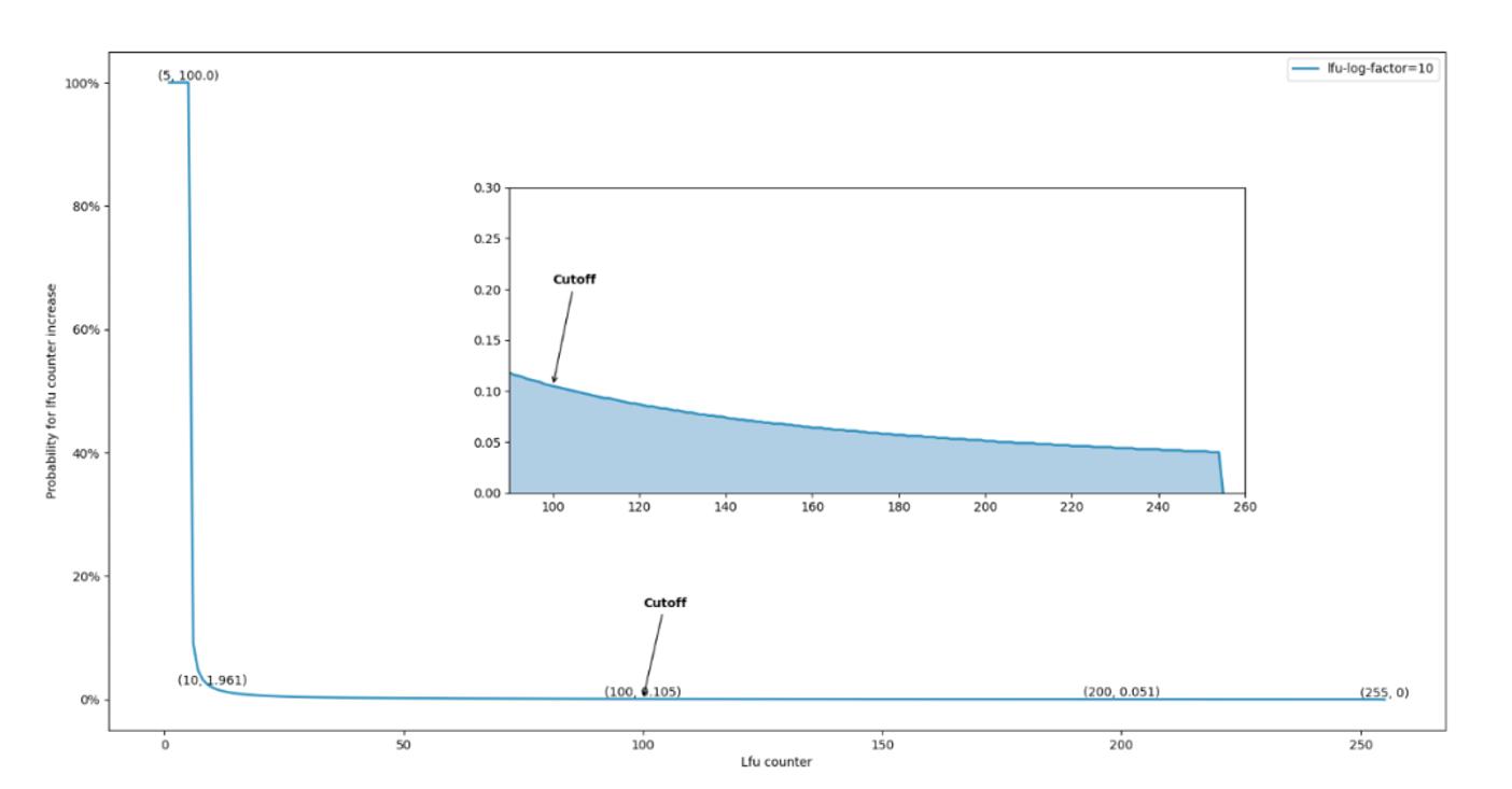 可以清晰的观察到,当 LFU counter 数值超过 LFU_INIT_VAL 之后,曲线出现了垂直下降,递增概率陡降到 0.2% 左右,随后在底部形成一个较为缓慢的衰减曲线,直至 counter 数值达到 255 则递增概率归于 0,贴合上面的分析理论。