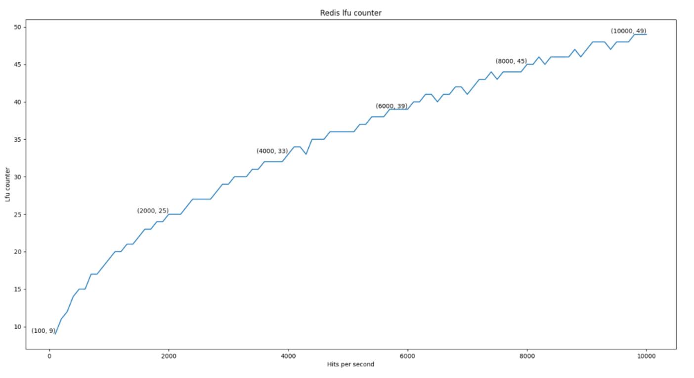 随着访问次数的不断增加,LFU counter 数值曲线呈现出爬坡式的递增,形态趋近于根号曲线,由此推测出以下观点: