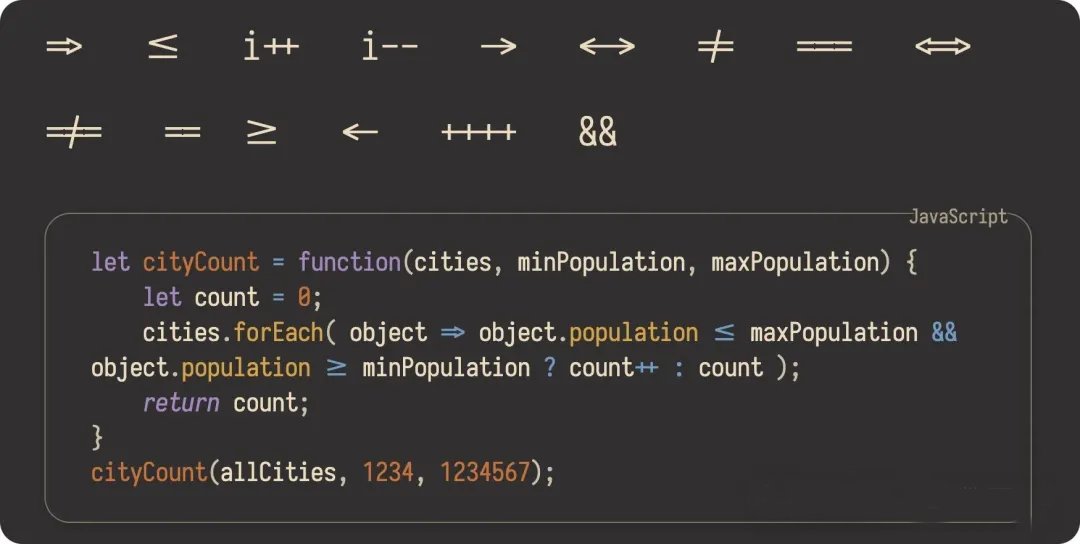 连字 (Ligature) 遇到特定连续的字符时会进行组合,优化阅读体验。在编程语言中,连字特性也能让数学运算符号更容易的阅读,如输入 != 时,会显示为 ≠