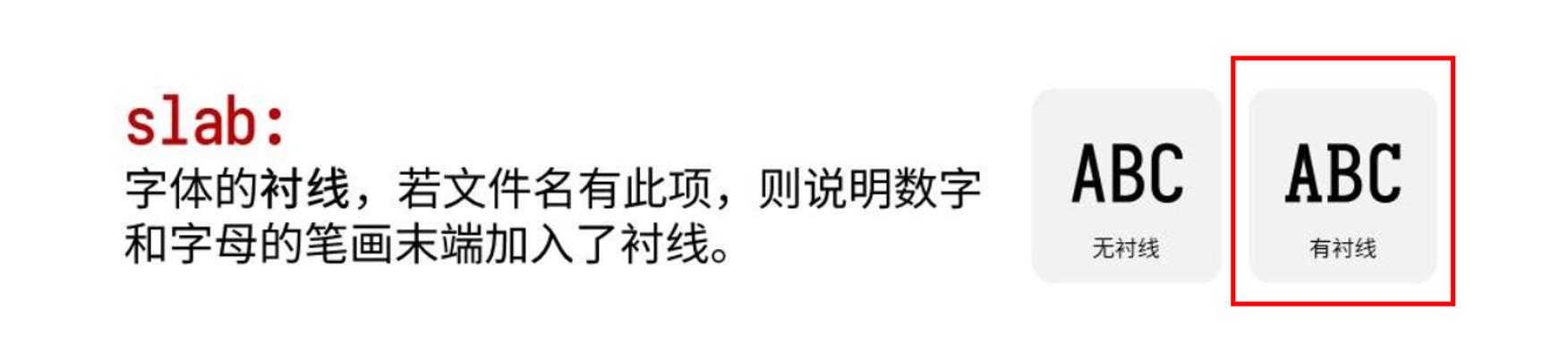 Slab: 粗衬线体。在原字形基础上增加了 Slab serif 的特征,使其更具有辨识度。
