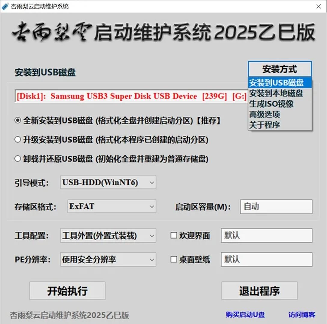双击Usm.exe即可选择三种部署方式:安装到本地硬盘(开机通过启动菜单进入)、制作U盘启动盘(支持NTFS/exFAT格式)、生成ISO镜像(用于光盘刻录或Ventoy多合一启动盘)。特别设计的"智能分区方案"会自动匹配新旧硬件—— Legacy模式下创建FAT32引导分区,UEFI模式则采用GPT分区表。