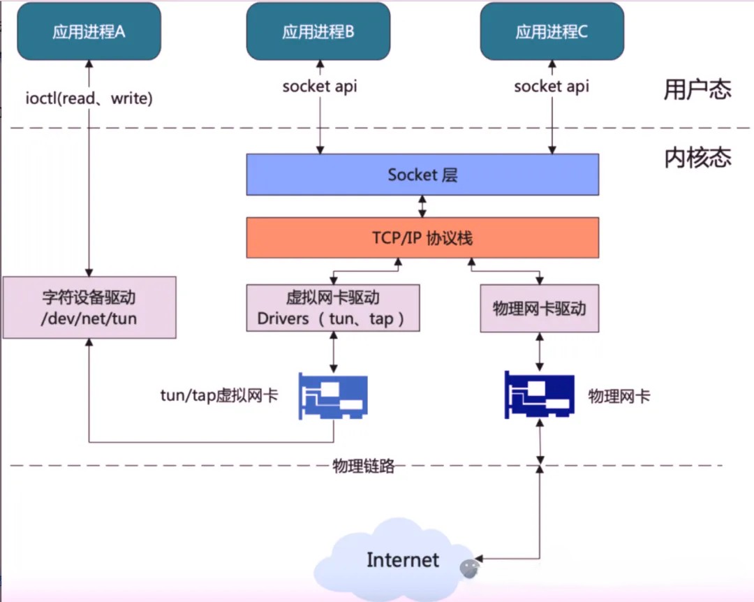 Tun/Tap驱动程序中包含两个部分,一部分是字符设备驱动,还有一部分是网卡驱动部分。利用网卡驱动部分接收来自TCP/IP协议栈的网络分包并发送或者反过来将接收到的网络分包传给协议栈处理,而字符驱动部分则将网络分包在用户空间和内核空间之间传送,模拟物理链路的数据接收和发送。Tun/Tap驱动很好的实现了两种驱动的结合。